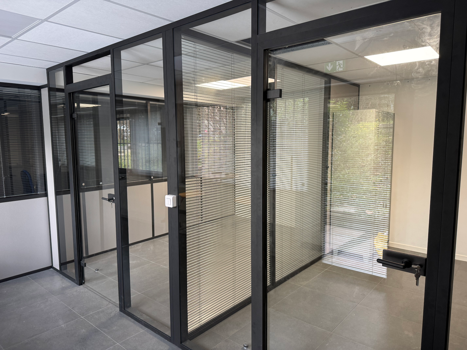 Conseil, création et pose de cloisons amovibles en aluminium laqué noir vitrées avec stores intégrés pour vos espaces professionnels